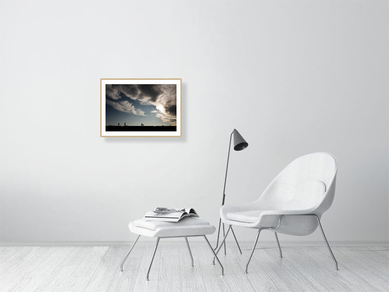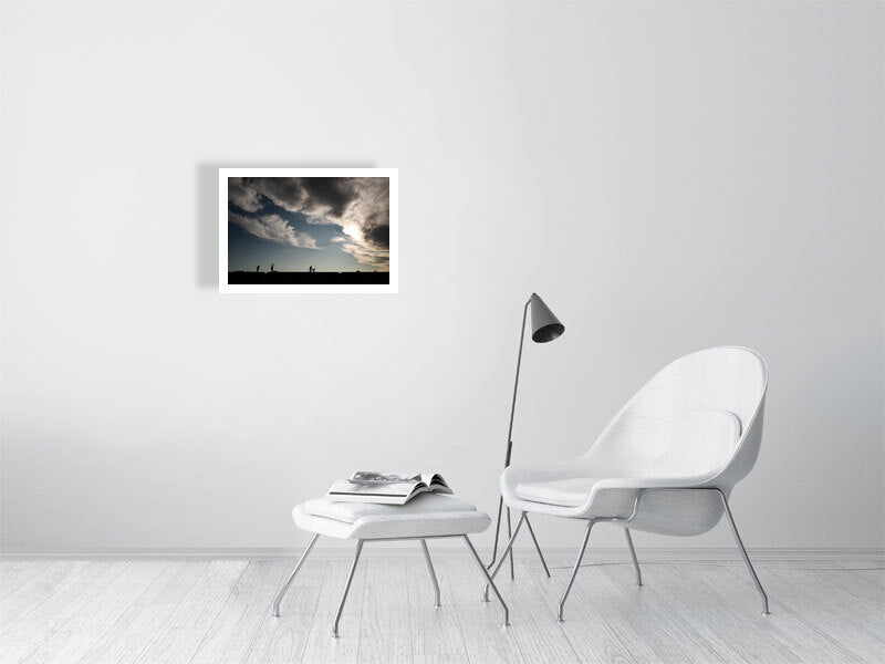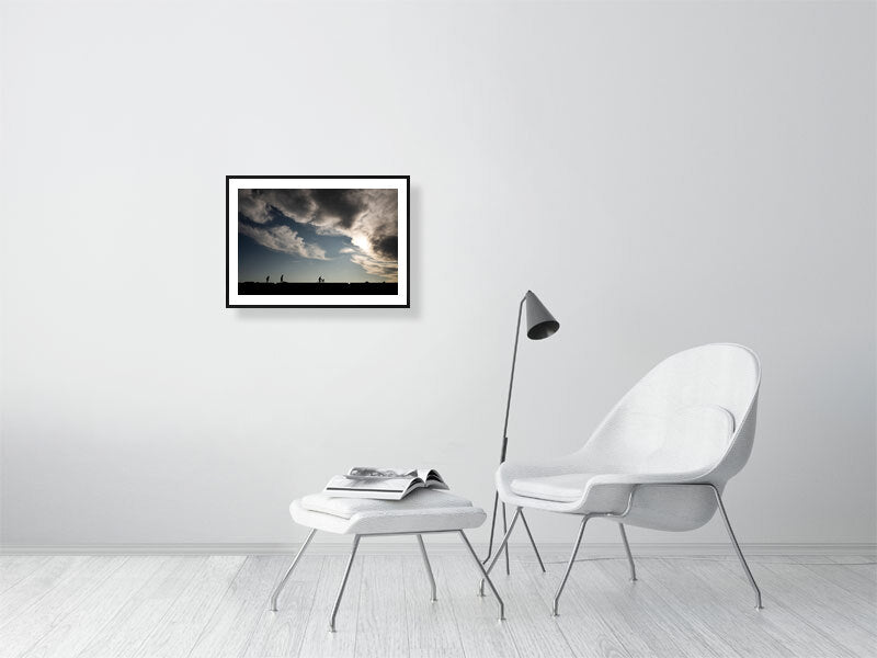 Fine art colour photography print depicting people wlaking across the harbour wall, shot at Scheveningen in The Hague, Netherlands.