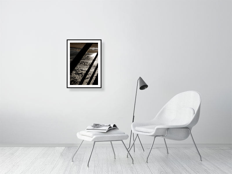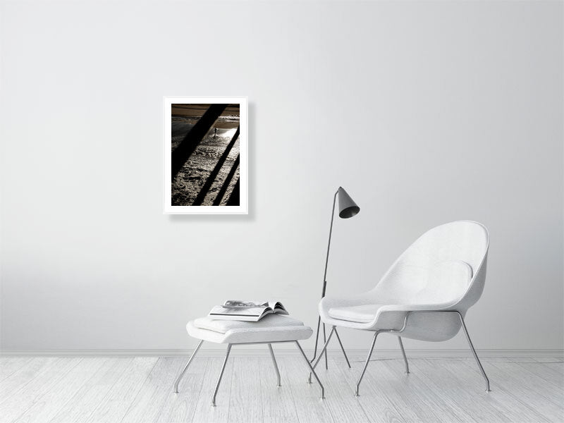 A surfer and the sea. The railing of the Scheveningen Pier bisect the scene.