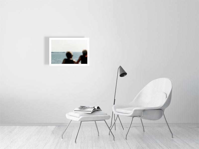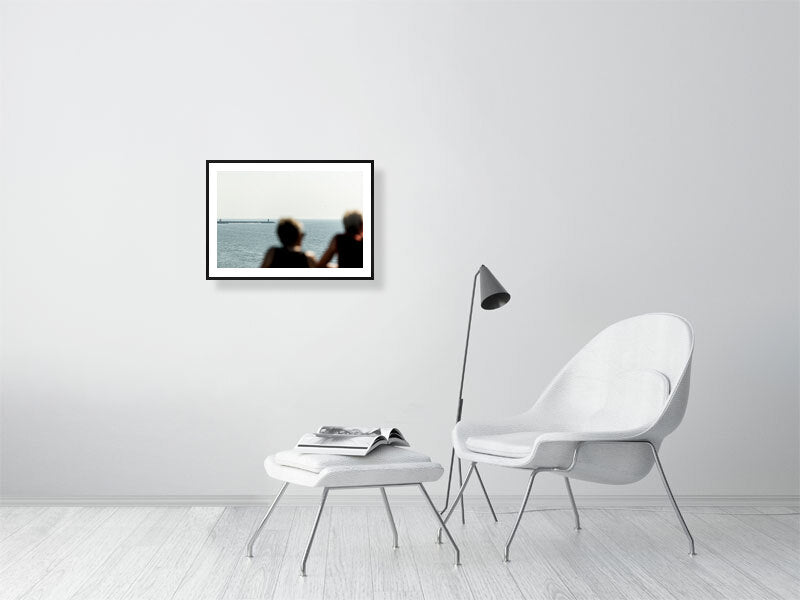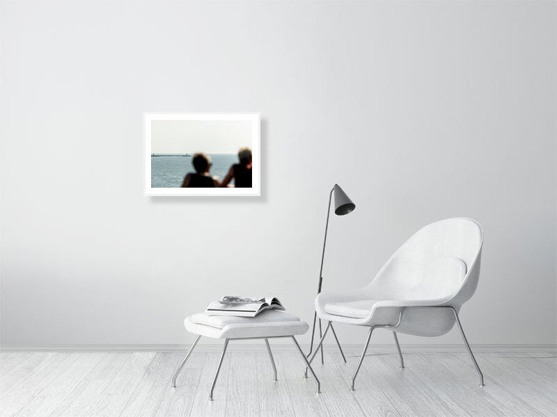 A fine art photographic print - A couple soak up the sun and the view at Scheveningen Pier. The Red Lighthouse is visible in the distance.